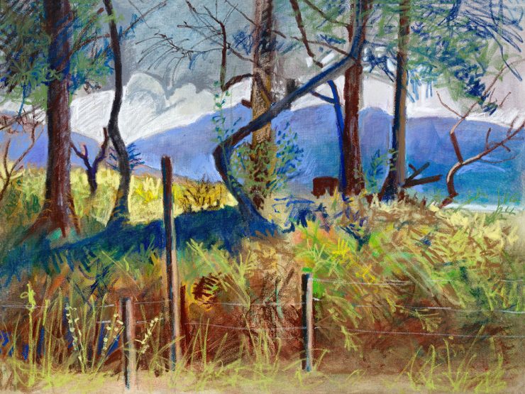 Lilac Hills above Loch Sunart – Oil pastel on canvas (H60cm x W 80cm)