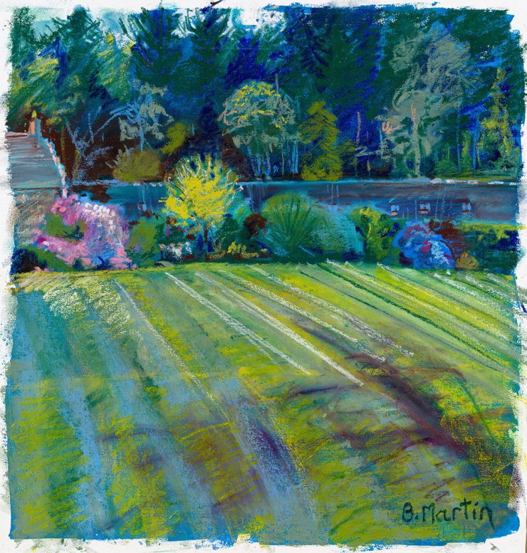 Stripey lawns on Dallas Estate – Oil pastel on canvas Framed (H83cm-x-W83cm)